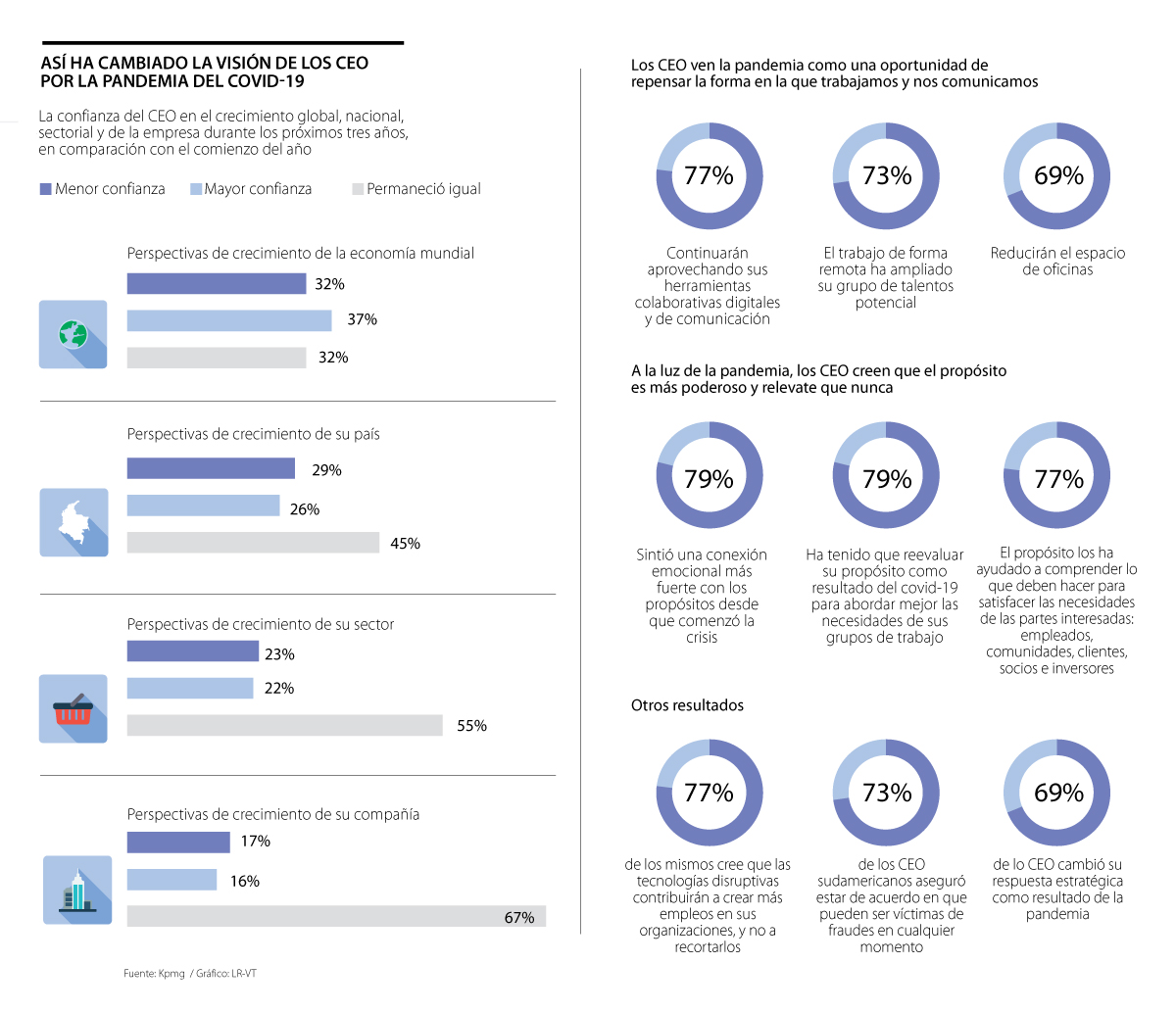 En medio de la crisis que afronta el mundo por el covid-19 con más de 31,6 millones de casos confirmados, de los cuales se han recuperado más de 21,7 millones de pacientes, siete de cada 10 líderes empresariales de la región dijeron que los temas ambientales, de sostenibilidad y de gobernanza serán los fundamentales para impulsar el crecimiento a largo plazo de las empresas, según el informe CEO Outlook de Kpmg.