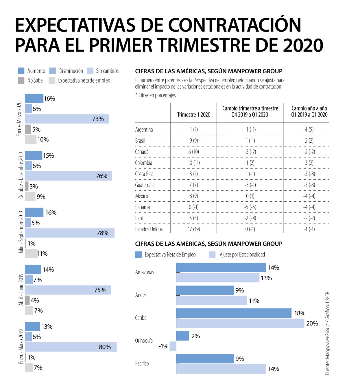 Tras un aumento de 6% en el salario mínimo para 2020, las expectativas de contratación para los primeros tres meses del año son modestas. Así lo revela el más reciente estudio de Manpower Group, titulado ‘Encuesta de Expectativas de Empleo’, en el que se concluye que 73% de los empleados colombianos no espera ningún cambio en sus organizaciones, mientras tan solo 16% anticipa un aumento en las nóminas.