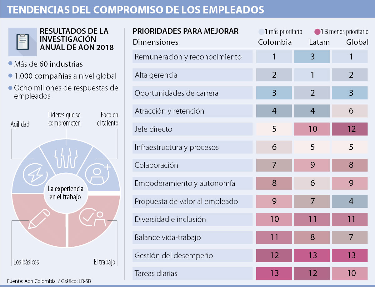 Según el directivo, esas evaluaciones cada vez más periódicas permiten examinar si las expectativas del empleado se están cumpliendo en los “momentos de verdad” y así mismo, proponer nuevas ideas, pues aunque el estudio de Aon rescata que en Colombia y Latinoamérica los empleados tienen altos niveles de compromiso (75% frente a 65% a nivel global), las compañías pueden mejorar.
