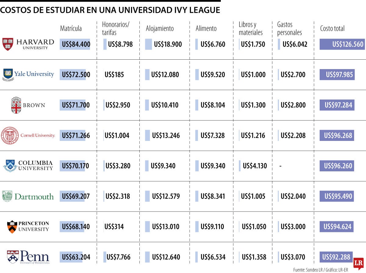 ¿Se ha preguntado cuánto podría costar estudiar en una de las universidades del prestigioso grupo de élite Ivy League? Nos dimos a la tarea de averiguarlo y descubrimos que su calidad es tan alta como sus precios. Antes que nada, ¿cuáles son las instituciones que conforman el listado? Harvard, Yale, Brown, Cornell, Columbia, Dartmouth, Princeton y la Universidad de Pensilvania hacen parte del bloque y son algunas de las universidades más reconocidas de todo el planeta. Sus costos anuales oscilan entre US$126.560 y US$92.288. Estos precios fueron obtenidos de las páginas oficiales para el periodo 2026, con corte a marzo.