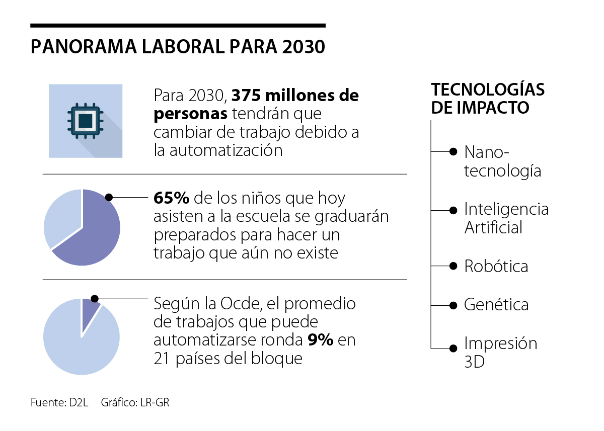 Frente a esa necesidad, las escuelas ya comienzan a proyectarse al futuro del mercado laboral. Tanto así, que el Foro Económico Mundial destacó que 65% de los niños que hoy asisten a la escuela se graduarán preparados para hacer un trabajo que aún no existe. Esto gracias a la convergencia de nuevas tecnologías como nanotecnología, inteligencia artificial, robótica, genética e impresión 3D.