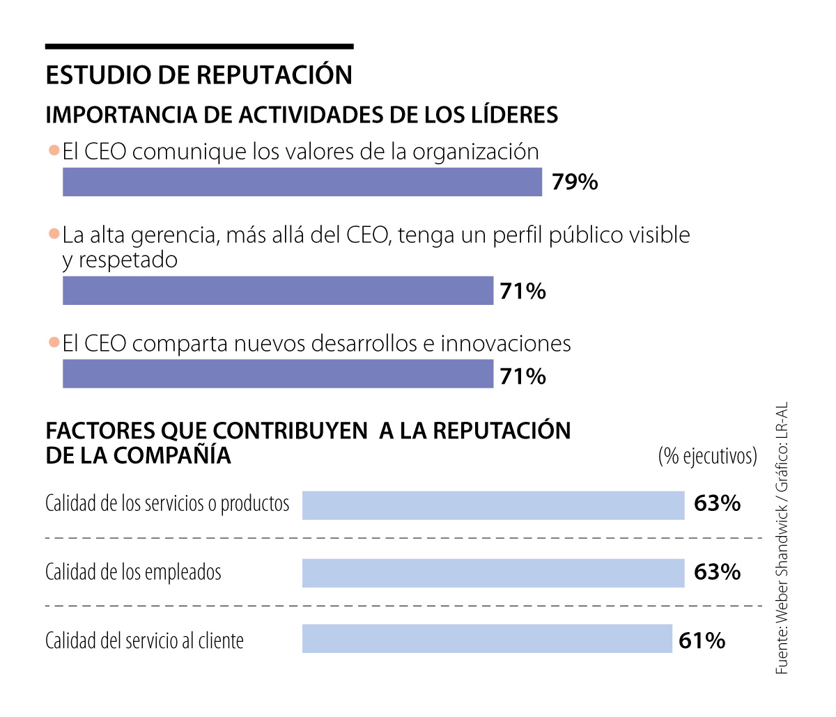 Al preguntarles qué actividades deben realizar los líderes en sus compañías con el fin de mejorar su reputación, 79% consideró que lo más significativo es que el CEO comunique constantemente, no solo con el público general, sino con sus empleados, los valores de la organización. En segundo lugar, con 71% de las respuestas, los ejecutivos señalaron que es fundamental que la gerencia tenga un alto nivel de experiencia y liderazgo, y que no solo sea el CEO el que tenga un perfil público, sino que este grupo también sea reconocido y valorado.