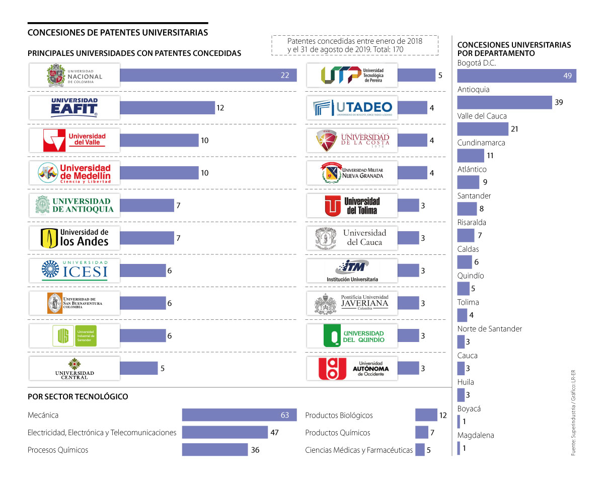 La Universidad Nacional lidera como la institución de educación superior con más registros de este tipo, con 22 inscritas, lo que equivale a 12,9% del total de las patentes que la SIC concedió en este periodo a universidades. Le sigue la U. Eafit, que logró la concesión de 12 patentes, y tras esta se ubican la Universidad del Valle y la Universidad de Medellín, cada una con 10 patentes registradas en este periodo.