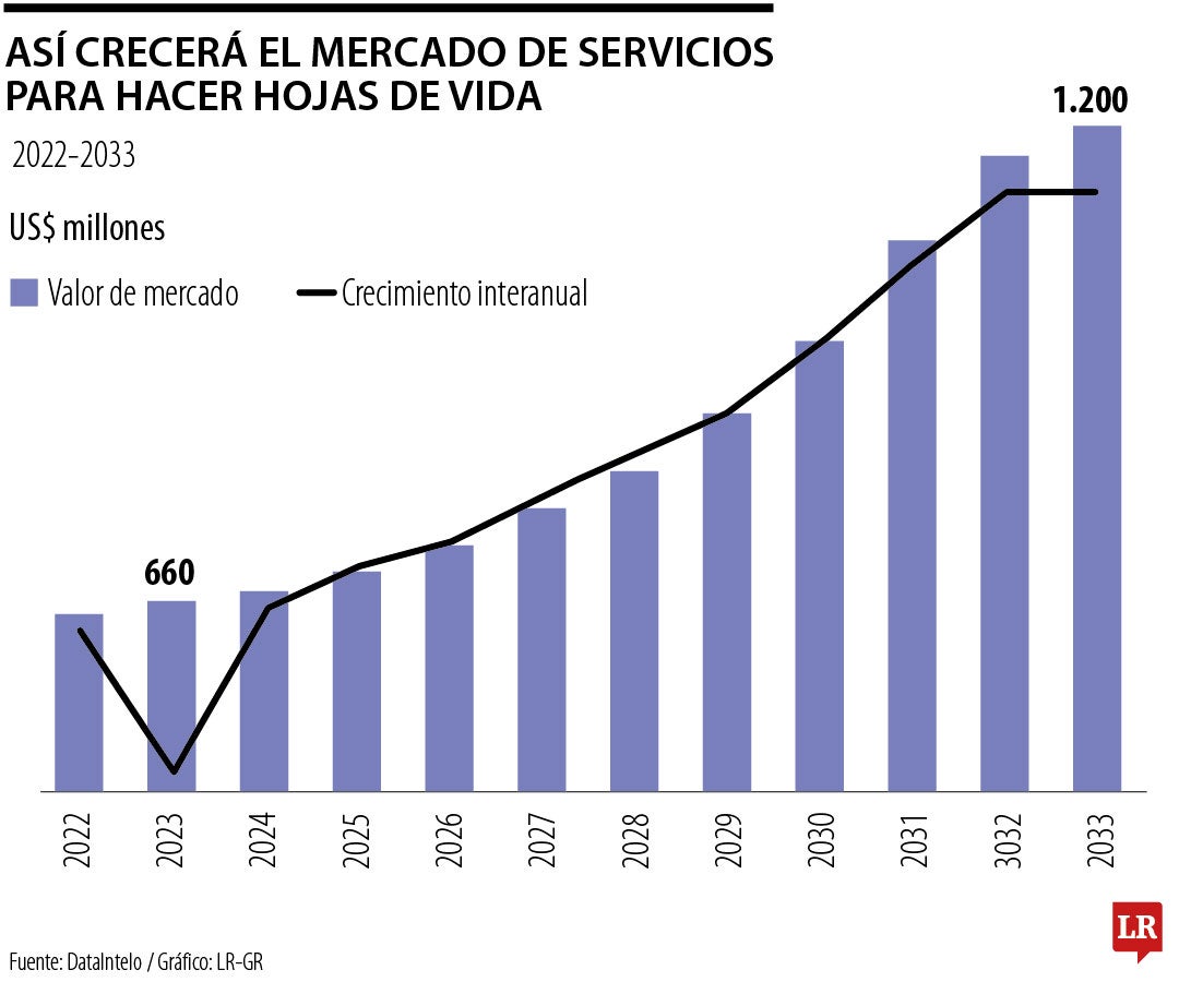 Según un informe de la firma de consultoría e investigación, Dataintelo, el mercado global de servicios profesionales de redacción de hojas de vida alcanzó los US$660 millones en 2023, y se proyecta que llegará a US$1.200 millones en 2032, con un crecimiento anual de 6,1%. La tendencia muestra que cada vez más personas están dispuestas a invertir en una hoja de vida competitiva, en línea con la profesionalización tercerizada del proceso de aplicación laboral.