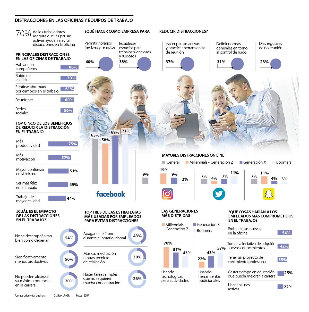 En cuanto a las distracciones en concreto, los trabajadores millennials son los más vulnerables a las distracciones, teniendo en cuenta que al momento de trabajar con estas herramientas tecnológicas ocho de cada 10 dijo que se enfocaba en otra cosa; y cuando lo hacen con otras tradicionales la cifra es de dos de cada 10; en contraste, los miembros de la Generación X registran 57% de distracción con tecnologías y 43% sin estas; por su parte los Boomers alcanzan rangos totalmente diferentes a los de las otras dos generaciones pues se distraen más con herramientas tradicionales que con algunas tecnológicas para lograr un 57% y 43%, respectivamente.