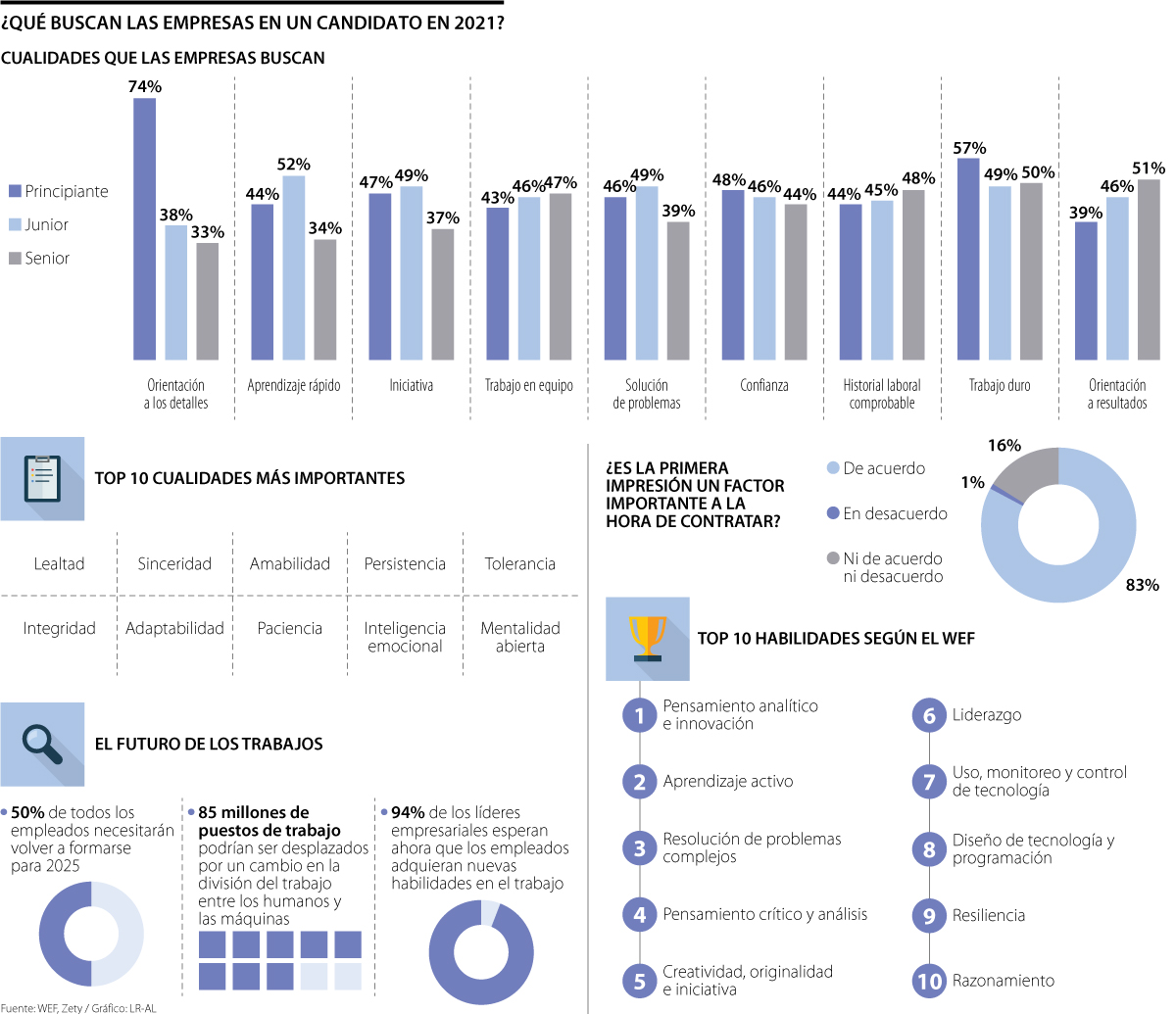 Según el informe sobre el Futuro de los Empleos del Foro Económico Mundial, 50% de todos los empleados necesitarán volver a formarse para 2025, a medida que aumente la adopción de la tecnología. Lo anterior representa un reto para la universidad y las mismas empresas, pero sobre todo a las personas. Ante estos cambios, LR le presenta las habilidad y aptitudes que están buscando los jefes de recursos humanos.