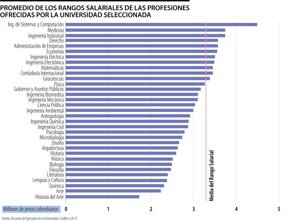 Un estudio de la Universidad Nacional de Colombia reveló el promedio de los rangos salariales de los profesionales. Los datos señalaron que en ingeniería de sistemas y computación registraron los más altos estándares, seguido de medicina, ingeniería industrial, derecho, administración de empresas, economía, ingeniería eléctrica e ingeniería electrónica.