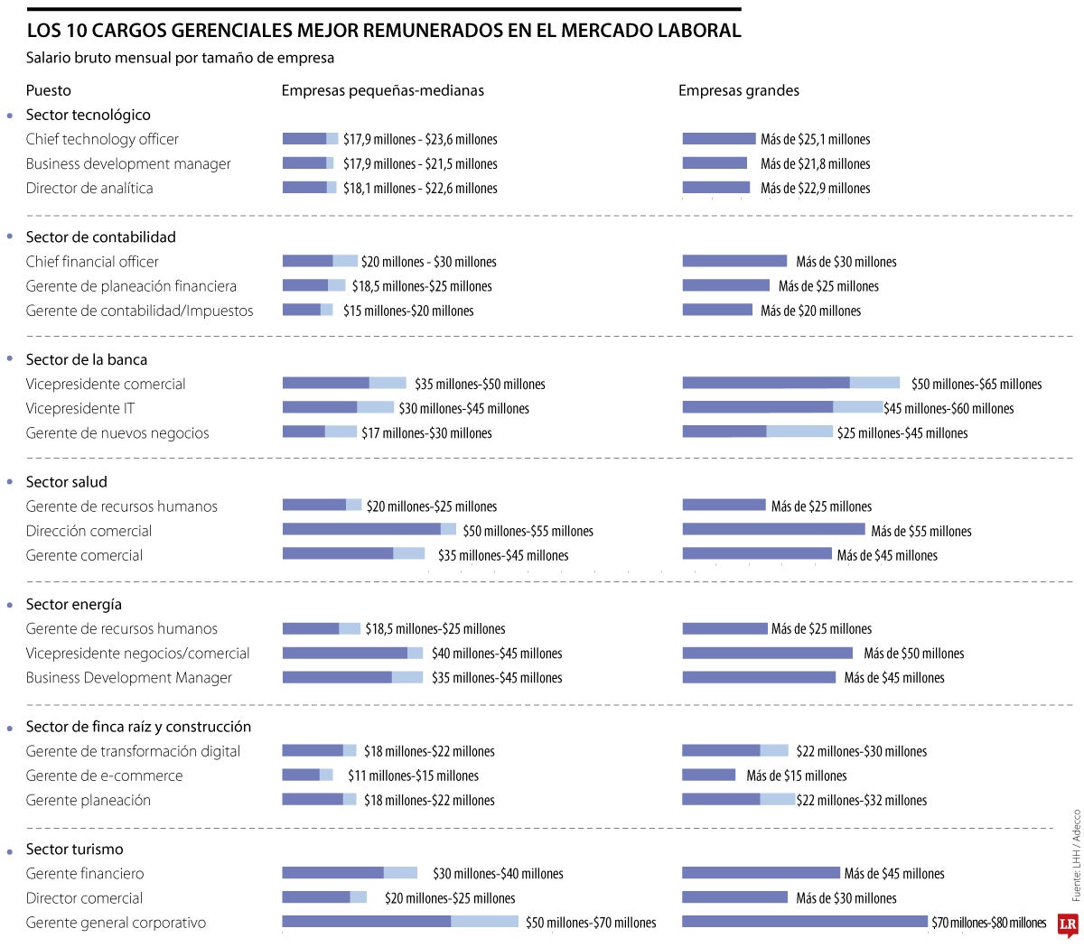 El sector de la banca, que tradicionalmente se ha identificado como uno de los que registran mejores salarios, tiene cargos como la vicepresidencia comercial, que en una empresa grande tendría como remuneración entre $50 millones a $65 millones, la vicepresidencia de tecnología superaría los $45 millones, y un gerente de nuevos negocios ganaría entre $25 millones a $45 millones en una compañía grande.