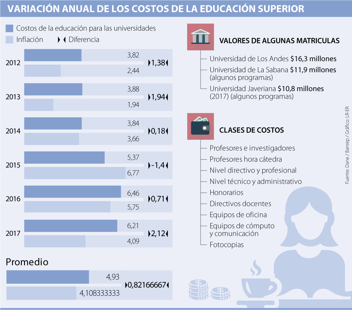 La educación de calidad en Colombia cada vez se está volviendo más costosa en términos reales, pues según cifras del Departamento Administrativo Nacional de Estadística (Dane), en los últimos seis años, en cinco oportunidades el incremento de los costos para las universidades ha sido superior a la inflación.