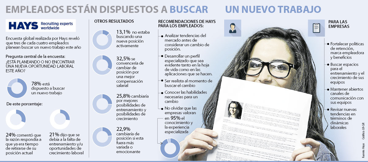 Por otro lado, 13,1% comentó que no estaban buscando una nueva posición activamente; 32,5% dijo que se convencerían de cambiar de posición si les ofrecieran una mejor compensación salarial; 25,8% cambiaría si les ofrecieran posibilidades de entrenamiento y crecimiento; mientras que 22,9% se movería si su nueva posición fuera más variada o emocionante.