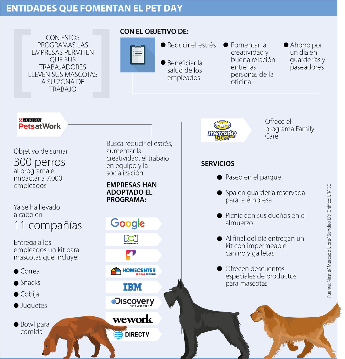 Purina, división de mascotas de la marca Nestlé, desde el año pasado decidió llevar la batuta del programa Purina Pets at Work el cual ya ha sido adoptado por 11 empresas en el país, entre las cuales resaltan Google, RCN Televisión, Homecenter, IBM, Discovery Networks, We Work y DirecTV. Adam Graves, gerente general de Purina en Colombia, afirmó que en “Nestlé somos unos apasionados de las mascotas, buscamos enriquecer sus vidas con productos de calidad e iniciativas como esta, que incentivan la tenencia responsable de la mascota y su bienestar, gracias al tiempo que comparte con las personas”.