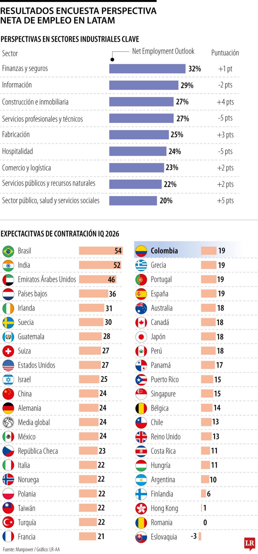 Para el caso de Colombia, el estudio reveló que la expectativa de contratación para estos primeros tres meses es de 19%, por encima de países como Perú (18%), Panamá (17%), Puerto Rico (15%), Chile (13%), Costa Rica (11%) y Argentina (10%). En cuanto a los servicios que serán más requeridos, señaló que serán los profesionales, científicos y técnicos, junto con los especializados en tecnologías de la información.