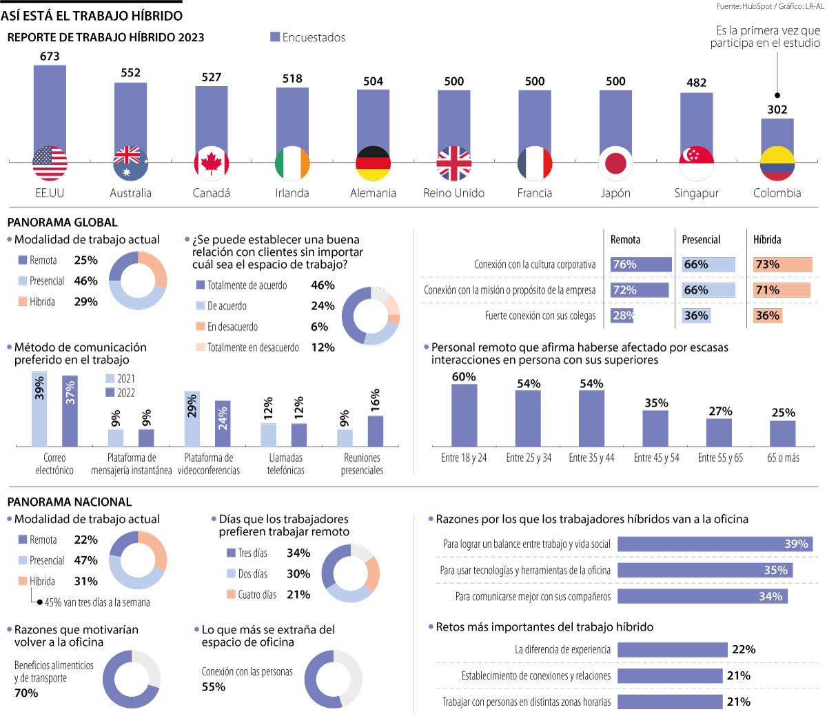 HubSpot, plataforma de gestión de relación con clientes (CRM por sus siglas en inglés), publicó su Hybrid Work Report para 2023, un estudio sobre cómo está funcionando el modelo de trabajo híbrido en el mundo, para el que consultaron a 5.058 personas de 10 países, entre ellos Colombia, el único país sudamericano analizado.