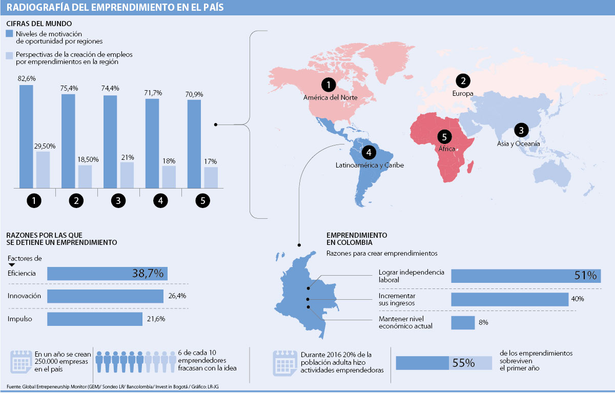 En un año, en el país se crean 250.000 empresas según estudios de Bancolombia, de los cuales 55% de ellos sobreviven el primer año y 20% a los primeros cinco años desde su creación. Según el más reciente estudio de Global Entrepeneurship Monitor (GEM), dentro de las razones por las que se detiene el emprendimiento están: 21,6% por el factor de impulso, 38,7% por eficiencia, y 26,4% por falta de innovación.