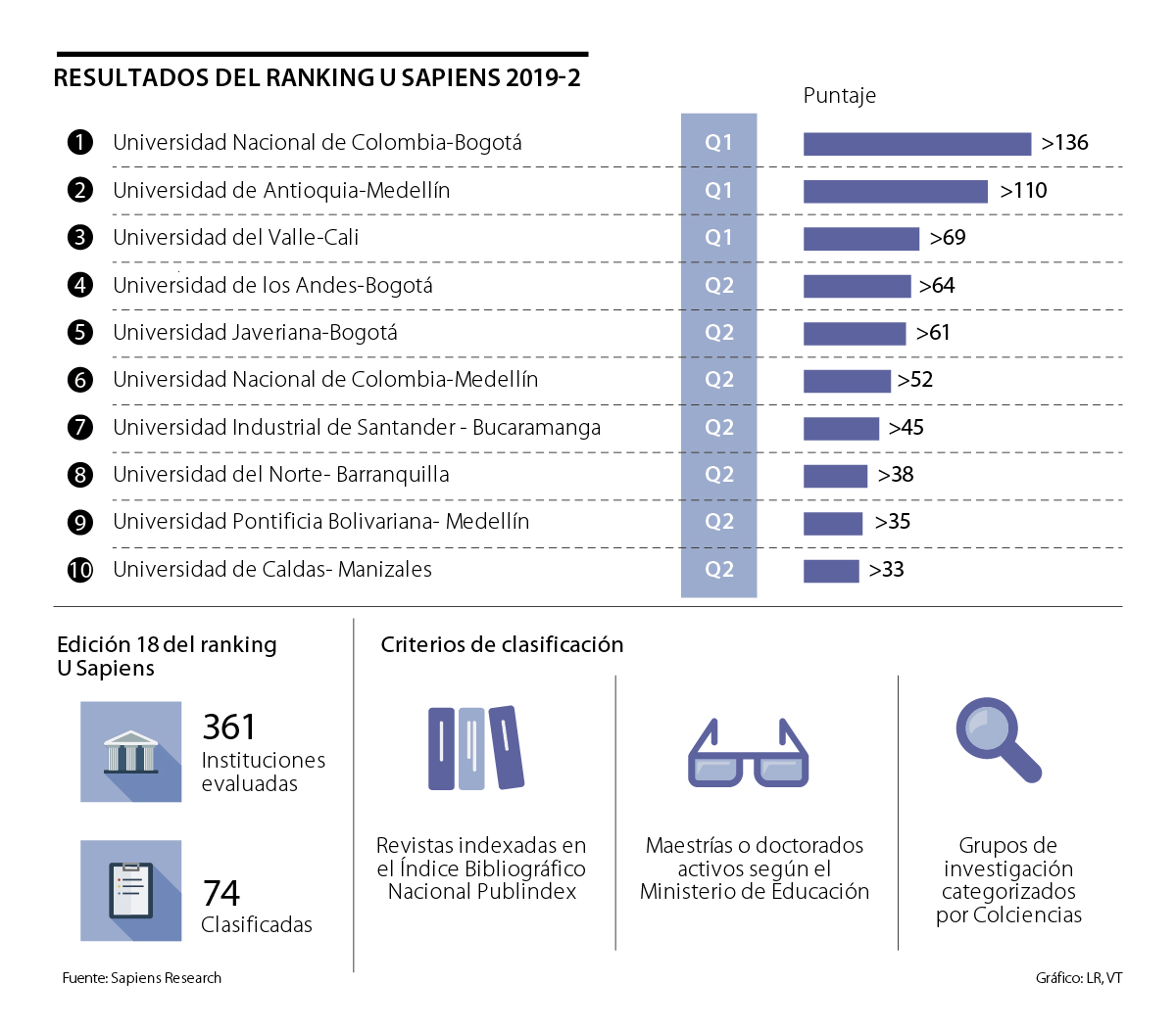A pesar de que Sapiens Research analizó 361 Instituciones de Educación Superior para la elaboración del ranking, solamente 74 cumplieron con los tres criterios que tiene presentes la consultora y clasificaron para la edición número 18 del listado. Los tres requisitos que verifica Sapiens Research es que las universidades tengan revistas indexadas en el Índice Bibliográfico Nacional-Publindex; maestrías o doctorados activos según el Ministerio de Educación Nacional, y grupos de investigación categorizados por Colciencias, lo que entrega los puntajes. (Ver gráfico)