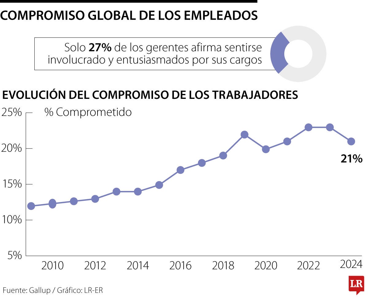 Una encuesta de Gallup sobre el compromiso laboral en las empresas reveló que los gerentes están experimentando un descenso en optimismo y gusto por su trabajo. Solo 27% aseguró el año pasado estar comprometido con su cargo , lo que representó una caída de tres puntos porcentuales. La disposición de los gerentes menores de 35 años cayó cinco puntos porcentuales, mientras que la de las mujeres cayó siete.