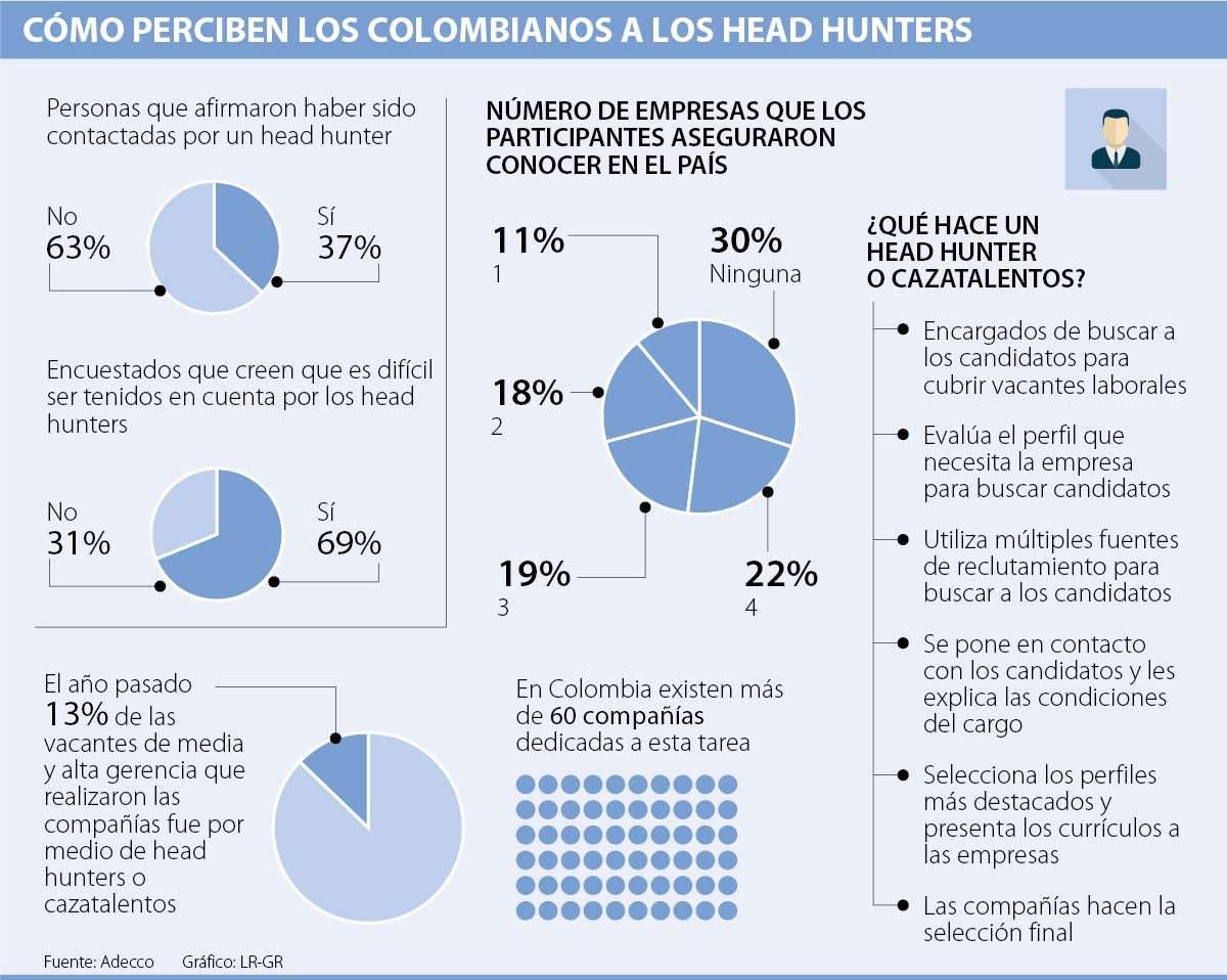 En el estudio de Adecco, la firma especializada en gestión de talento consultó a más de 200 trabajadores colombianos. De ellos, 37% afirmó haber sido contactado alguna vez por un cazatalentos para un proceso de selección. A pesar de que en el país existen más de 60 head hunters de diferentes tamaños y especializaciones, 30% de los encuestados aseguró no conocer a ninguno, y 70% restante solo referencia entre una y cuatro entidades.