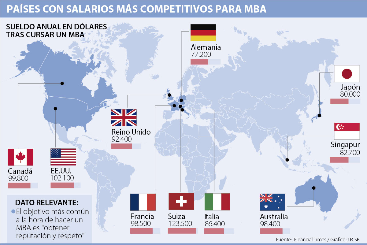 De acuerdo a un ranking del Financial Times, Suiza es el país con el salario anual más elevado para un profesional con MBA, pues asciende a US$123.500, seguido de EE.UU. con US$102.500, cifras que las ubican como las únicas naciones en superar la barrera de US$100.000. El top cinco global lo completan Canadá, Francia y Australia, con pagos anuales de US$99.800, US$98.500 y US$98.400 respectivamente.