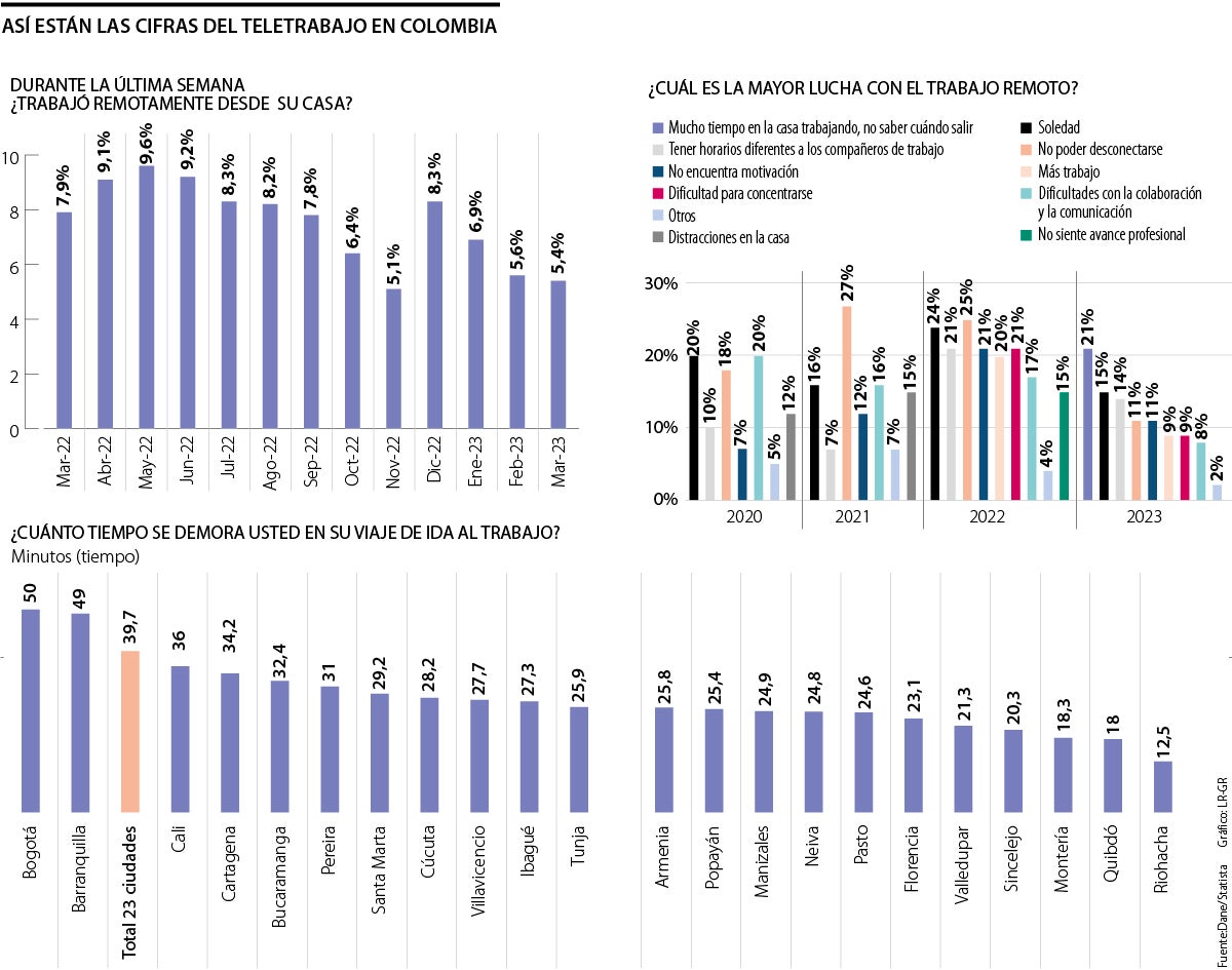 En el caso de Colombia, está tendencia parece estar teniendo también cabida. Cifras del Dane muestran cómo cada vez más el trabajo remoto está siendo asunto del pasado. En la última ‘Encuesta Pulso Social’ de esta entidad, las personas que afirmaron trabajar remotamente pasaron de representar 9,1%, en abril de 2022, a 5,54% en marzo de este año (ver gráfico).