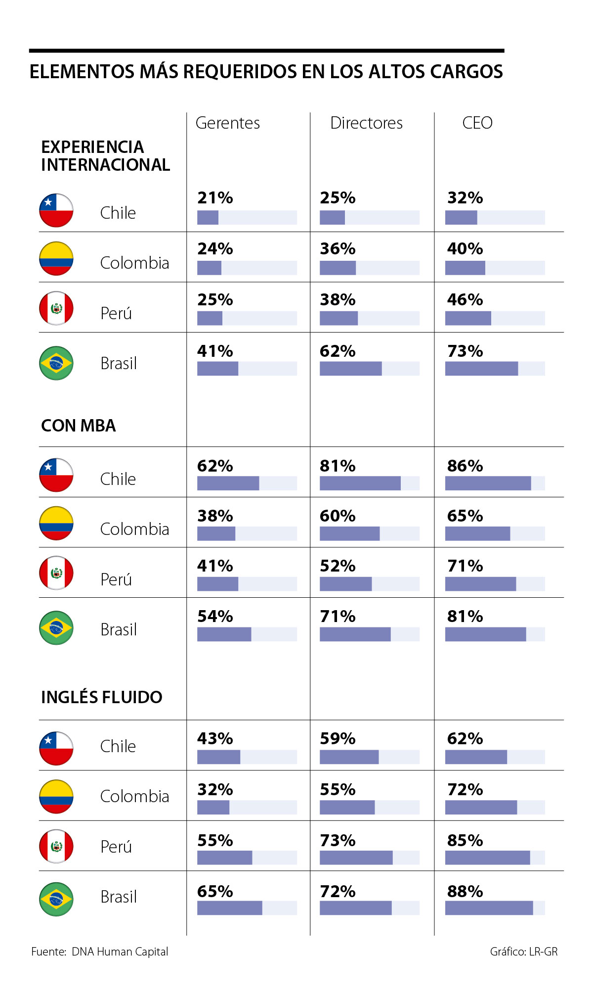 Con base en lo anterior, DNA Human Capital realizó un estudio para saber cuál de las anteriores opciones es la que más eligen los profesionales de cuatro países de la región (Colombia, Chile, Perú y Brasil). A pesar de que las inclinaciones de los ejecutivos de cada país son diferentes, la compañía encontró que “el elemento más requerido en un alto cargo es el dominio del inglés, con 95% de demanda en empresas transnacionales”.