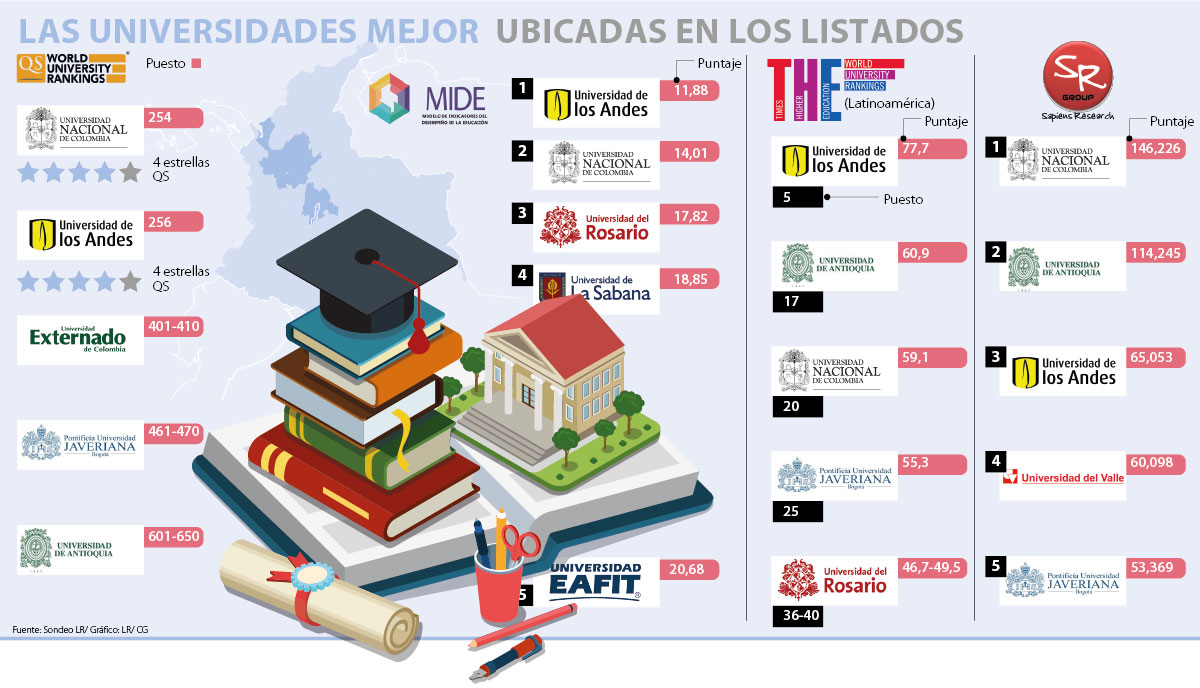 Si bien hay más de 40 universidades con acreditación de alta calidad en el país, los nombres que aparecen de las instituciones líderes en calidad suelen ser casi siempre los mismos. Dependiendo de la naturaleza del listado, emergen universidades diferentes en el tope de los listados; sin embargo, la Universidad Nacional y la Universidad de Los Andes mantienen posiciones privilegiadas siempre. En los listados más recientes, también hay gran participación de la Universidad de Antioquia, la Pontificia Universidad Javeriana y la Universidad del Rosario.
