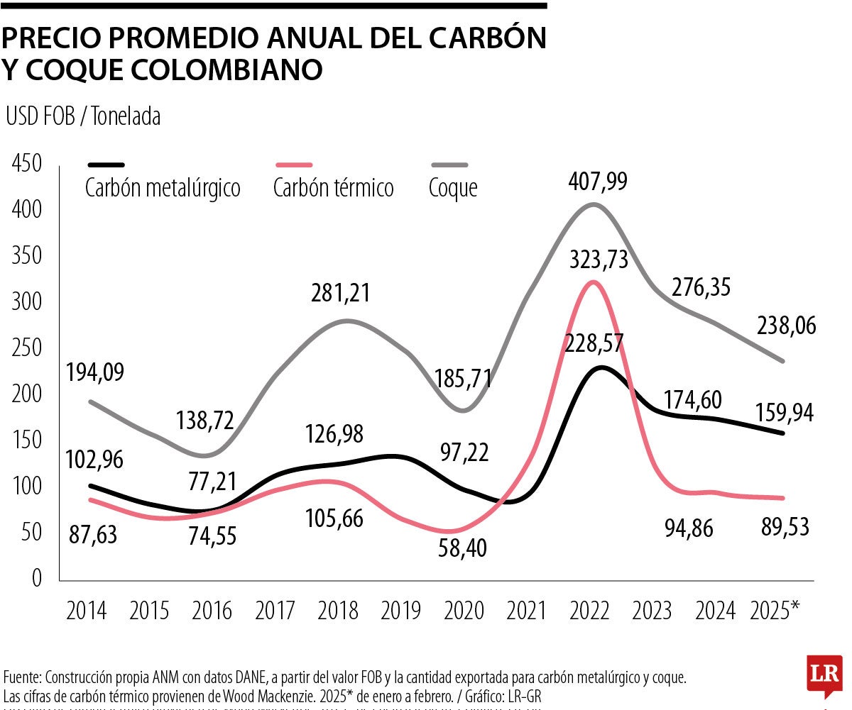 Allí, se proyectó que, a pesar del posible incremento del consumo de carbón a nivel global y en especial en el mercado asiático, se corría el riesgo que Colombia fuera menos competitiva respecto otros oferentes ubicados cerca de ese mercado, principalmente por los costos asociados a los fletes, producto de su ubicación geográfica respecto a los centros de consumo. Hoy, los hechos se decantan por el derrotero de uno de los escenarios analizados, quizás el más adverso. Los precios del carbón térmico, metalúrgico y del coque al finalizar 2024, como resultado de una sobreoferta mundial, presentaron una tendencia decreciente, comparable solo al nivel de los precios de la prepandemia, como se puede apreciar en la siguiente gráfica: