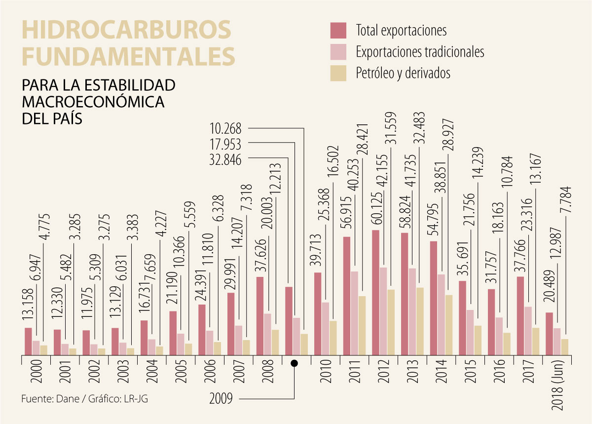 Ello obedece al peso específico de los hidrocarburos en el PIB, dado que ha llegado a representar hasta 8% y en el sector externo, 55% de la totalidad de las exportaciones. Con la destorcida de los precios, además del crecimiento de la economía y las exportaciones, también se vieron afectados los ingresos del Estado, tanto los del Gobierno central como los de las entidades territoriales. Tanto más en cuanto que el impacto se dio por partida doble, dado que a la caída de precios se vino a sumar la caída en la producción, la cual, después de haber alcanzado el millón de barriles diarios en 2013, a partir de 2014, la misma ha venido decayendo año a año, hasta alcanzar a duras penas los 854.121 millones en 2017.