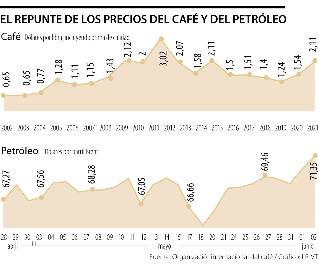 Todos los commodities, entre ellos también el carbón y el café, que sumados al petróleo representan 60% de nuestras exportaciones, están registrando aumentos en sus precios por las mismas razones. Es así como el carbón térmico de referencia Puerto Bolívar, después de haber alcanzado cotizaciones que bordearon los US$35 la tonelada, el 2 de junio se trepó hasta los US$81,5 la tonelada. Y el café no se quedó atrás, el 1º de junio se cotizó a US$2,11 la libra, precio este que no se veía desde mayo de 2014.
