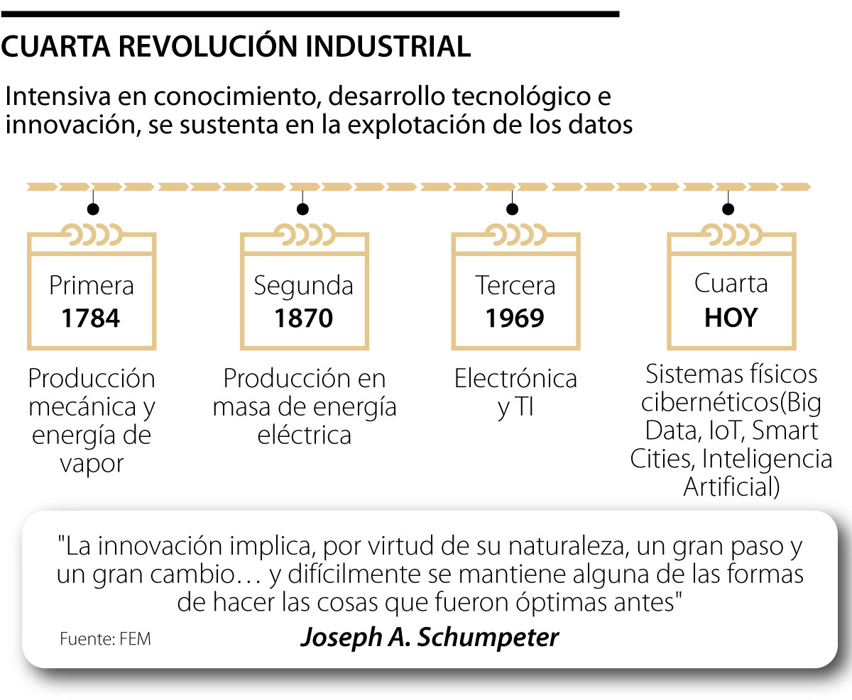 Como bien lo dijo Joseph A. Schumpeter, “la innovación implica, por virtud de su naturaleza, un gran paso y un gran cambio…y difícilmente se mantiene alguna de las formas de hacer las cosas que fueron óptimas antes”. Y es propio de la innovación y la tecnología su evolución disruptiva, a saltos. Así se explica que la primera revolución industrial (1784) fue posible gracias a la invención de la máquina a vapor, la segunda (1870) se caracterizó por la generación eléctrica a gran escala, concomitantemente con la invención del motor de combustión interna, la tercera (1969) por la electrónica y las tecnologías de la información y la cuarta, la actual, por los sistemas físicos cibernéticos (Big Data, IoT, Smart Cities y la inteligencia artificial).