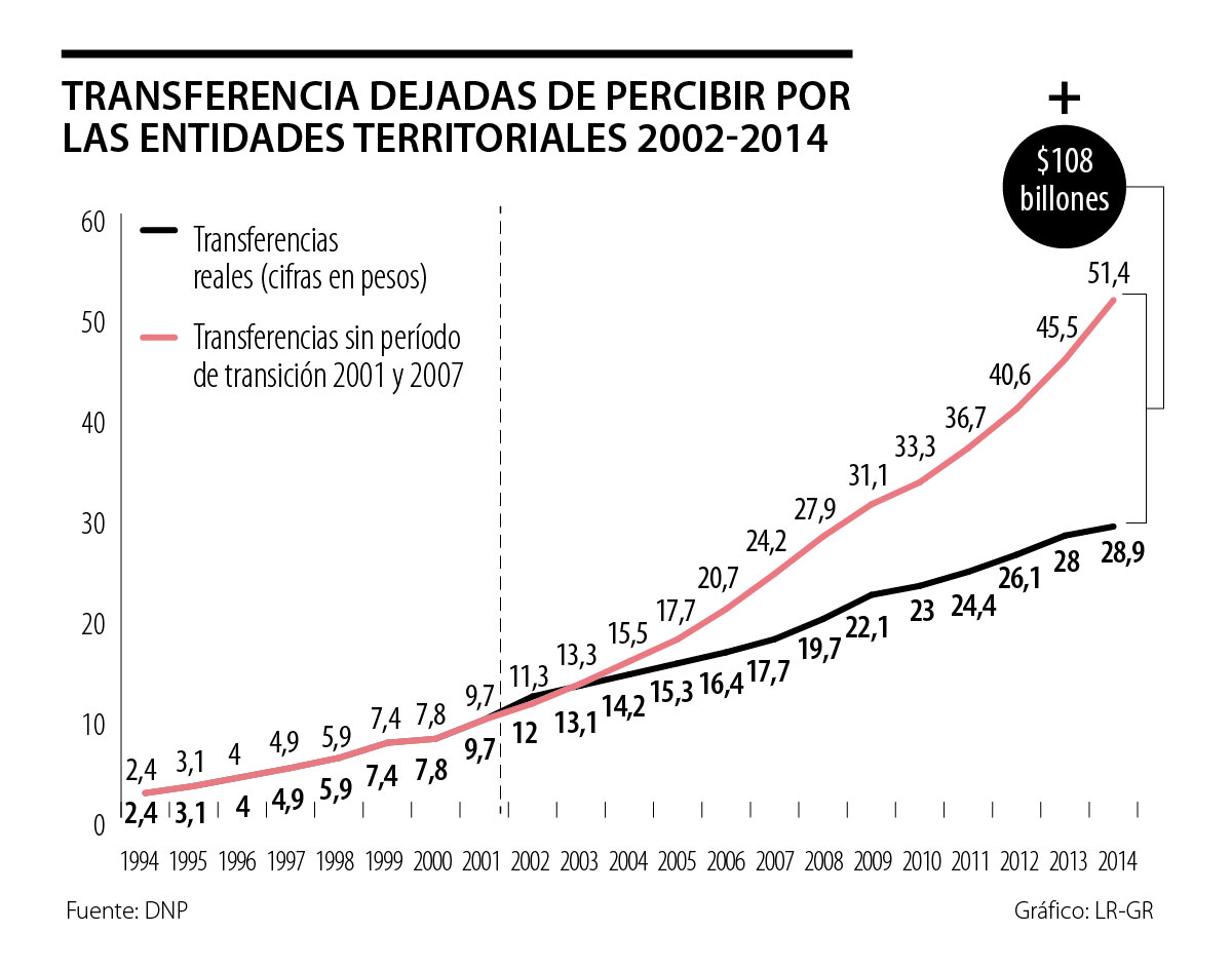 De no haberse aprobado los actos legislativos 01 de 2001 y 04 de 2007, los recursos del SGP representarían en este momento el 46,5% de los ICN, pero merced a ellos a duras penas llegan al 29%, menos de lo que representaban en 1990, el 31.5% (¡!). Según estudio del Banco de la República, dichos recursos “como porcentaje del PIB pasó de representar el 4,8% en 2002 a 3,8% en 2012 y con respecto a los ICN la reducción fue de más de 10 puntos porcentuales al pasar de representar el 40% en 2002 a representar el 28% en 2012”.