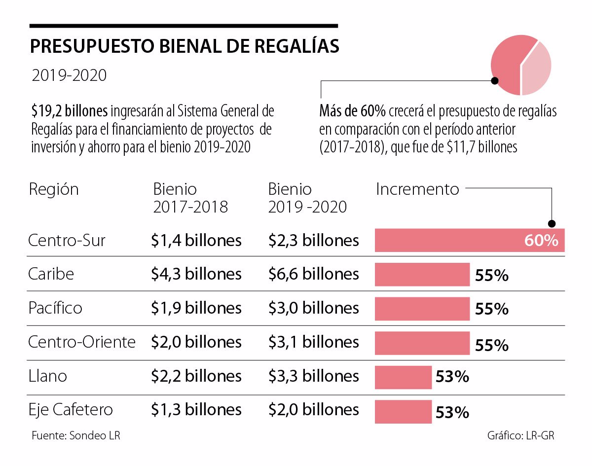 A renglón seguido se dice en el Artículo 54°:“autorización para el uso de recursos de mayor recaudo…1. Incorpórese al Presupuesto de Ingresos del Sistema General de Regalías para el bienio 2019 - 2020, la suma de $3.743.368.299.111, resultante de la diferencia entre el valor presupuesto para este bienio y el valor efectivamente recaudado en la Cuenta Única del Sistema General de Regalías, así: