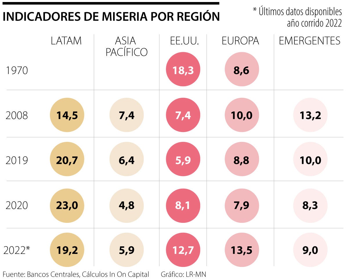Para retratar esta situación crítica de una familia en un contexto económico así, se creó un indicador llamado indicador de miseria, que se calcula sumando inflación y desempleo. Cuando nosotros hacemos los cálculos de ese indicador por las diferentes regiones, (Ver gráfico), hay una diferencia muy grande de lo que sucede en Estados Unidos frente a Europa y el resto del mundo, comparando con la crisis de 1973.