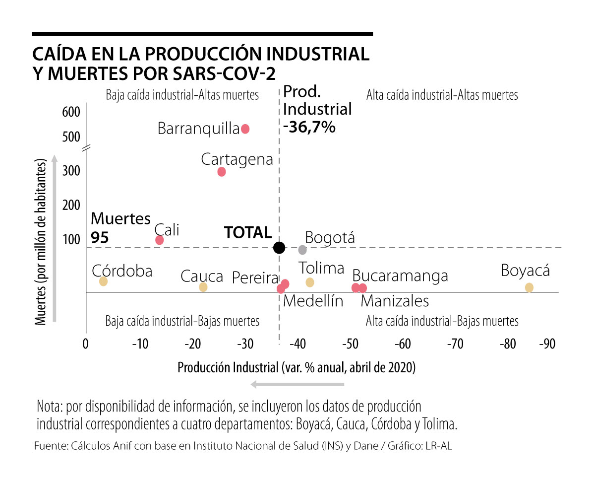 En el cuadrante de bajo impacto económico pero elevadas muertes, se ubican Barranquilla (caída del 30% anual), Cartagena (26%) y Cali (14%). Esto probablemente responde a que, en estas ciudades, por las excepciones del Decreto 457 de 2020, continuó funcionando la industria relacionada con la producción de bienes esenciales como los alimentos, los químicos-farmacéuticos y la refinación (esta última necesaria para garantizar los servicios básicos de transporte). En el cuadrante de baja caída industrial-bajas muertes, se encuentran ubicados los departamentos de Córdoba (caída industrial del 3.4%) y Cauca (22.4%).