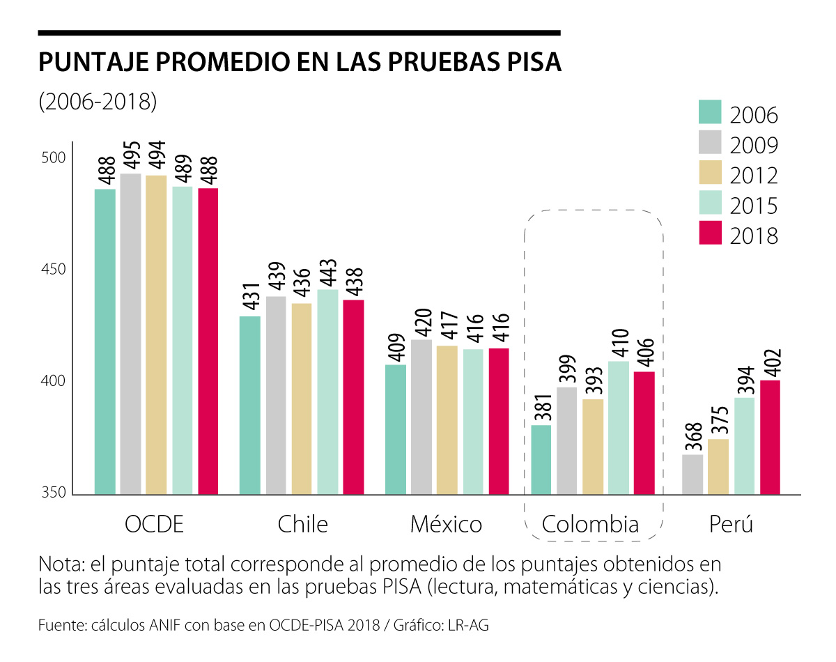 Los resultados más recientes de las pruebas PISA (Programa Internacional para la Evaluación de Estudiantes) del año 2018 muestran que Colombia se encuentra rezagada respecto a los niveles observados en países miembros de la Ocde, e incluso con relación al registro de América Latina. En efecto, el puntaje de Colombia en esas pruebas fue de 406, inferior al promedio de la Ocde (488), y a los registros de Chile (438) y México (416), solo superamos a Perú (402). Algo similar ocurre al compararnos con otros países con ingreso per cápita similar, por ejemplo, Serbia registró un puntaje promedio de 442 en 2018 (muy superior al de Colombia).