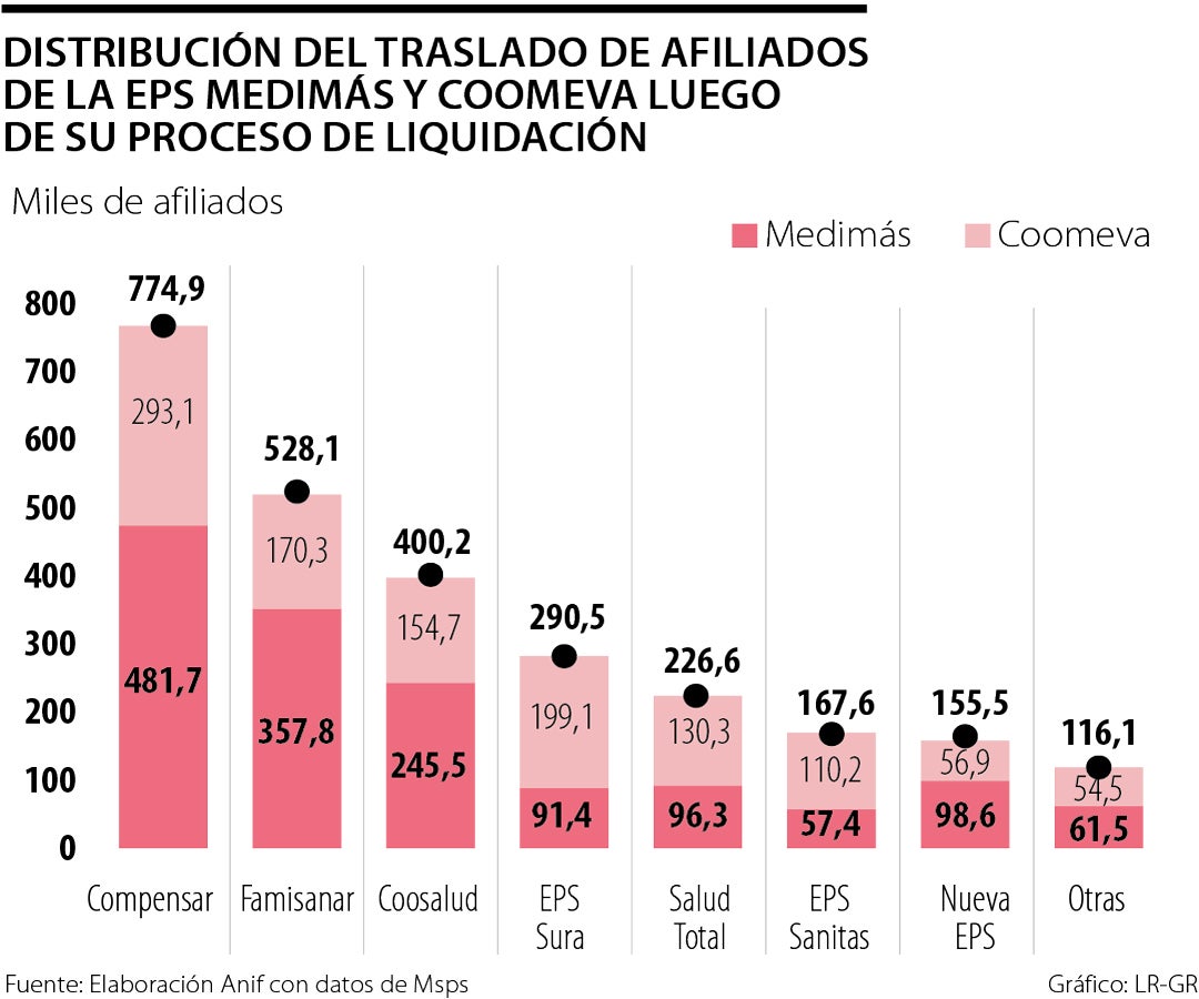 Así, ante una eventual liquidación de las aseguradoras, las consecuencias para el sistema son nefastas, lo que termina afectando directamente a los usuarios. En un primer momento, se registra un traslado masivo de usuarios, que impone mayores presiones sobre el sistema en su conjunto. Para no ir más lejos, el cierre de Medimás y Coomeva implicó el traspaso de más de 2,6 millones de afiliados (ver gráfico 1). De ellos, más de 60% fueron recibidos por EPS que actualmente se encuentran en proceso de intervención (Famisanar, Sanitas y Nueva EPS) y en liquidación voluntaria (Compensar), situación que pone en aprietos la condición financiera y administrativa de las EPS receptoras.