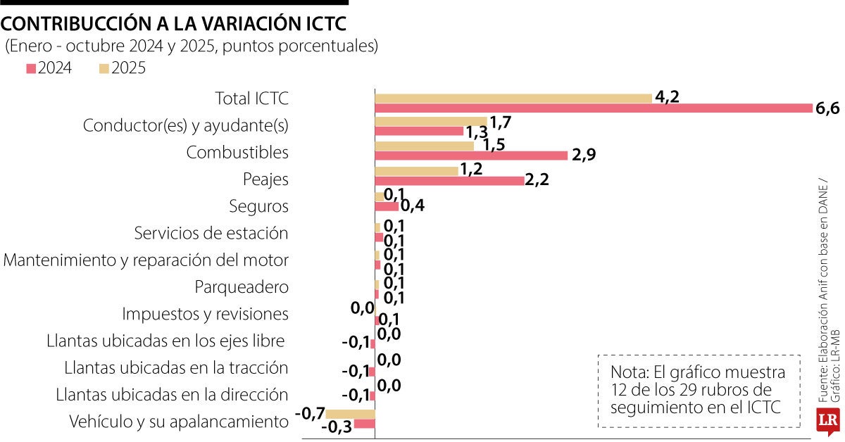 De acuerdo con el Índice de Costos del Transporte de Carga por Carretera (Ictc) publicado por el Dane, que hace seguimiento a 29 rubros representativos del transporte de carga terrestre, en octubre de 2025 estos costos crecieron un 6,0% anual. El rubro de combustible fue el que más contribuyó a la variación anual, aportando 3,0 puntos porcentuales (pp), seguido por conductores y ayudantes (1,8pp) y peajes (1,3pp). Por el contrario, vehículo y su apalancamiento (-0,7pp) y llantas de dirección y tracción (-0,1pp cada una) registraron contribuciones negativas. Este comportamiento es previsible dada la importancia de esos rubros en la operación logística del transporte de carga.
