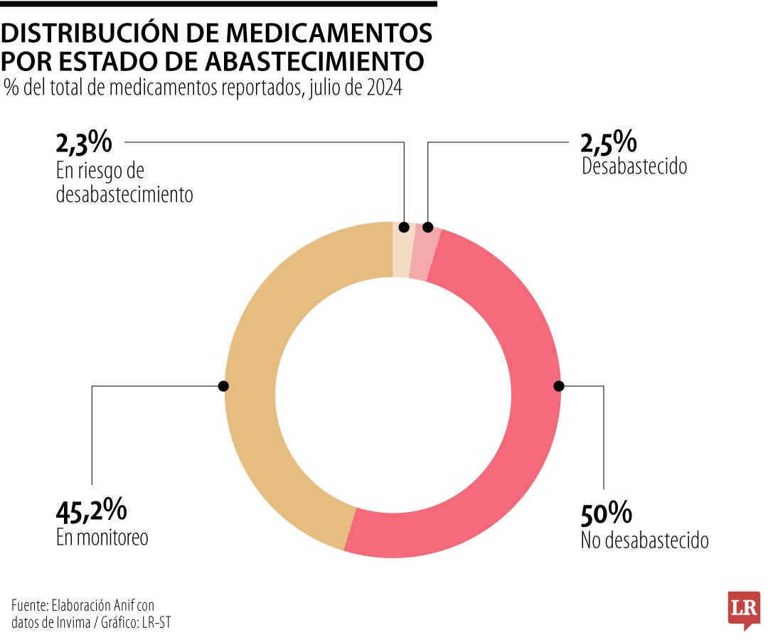 Según el último informe publicado por Invima con corte a julio de 2024, 2,5% de los medicamentos se encuentran desabastecidos y 2,3% está en riesgo de desabastecimiento, lo que sugiere que en el corto o mediano plazo puede no contar con existencias, ante una contingencia. Por otra parte, cerca de 180 de 396 medicamentos enlistados se encuentran en monitoreo, es decir, en seguimiento permanente, por limitación en la cantidad disponible (gráfico 1). En contraste, la entidad afirma que más de la mitad de los medicamentos cuenta con disponibilidad inmediata.