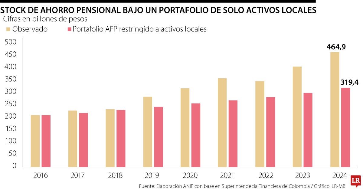 Considerando lo anterior, se realizó un ejercicio contrafactual ilustrativo con el objetivo de estimar el impacto que tendría el stock de ahorro pensional de las AFP si se hubiera invertido exclusivamente en activos locales. Bajo este escenario el total de ahorro pensional en 2024 hubiera sido de $319,4 billones, frente a los $464,9 billones observados en la realidad (Gráfico 1). Esto hubiera representado una reducción de 31,3% en el valor del ahorro pensional, equivalente a una pérdida de $145,4 billones. Para dimensionar esta magnitud, dicha pérdida equivale aproximadamente a 10 reformas tributarias. En otras palabras, restringir la inversión de las AFP únicamente a activos locales tendría un impacto sustancial sobre el crecimiento del ahorro pensional.