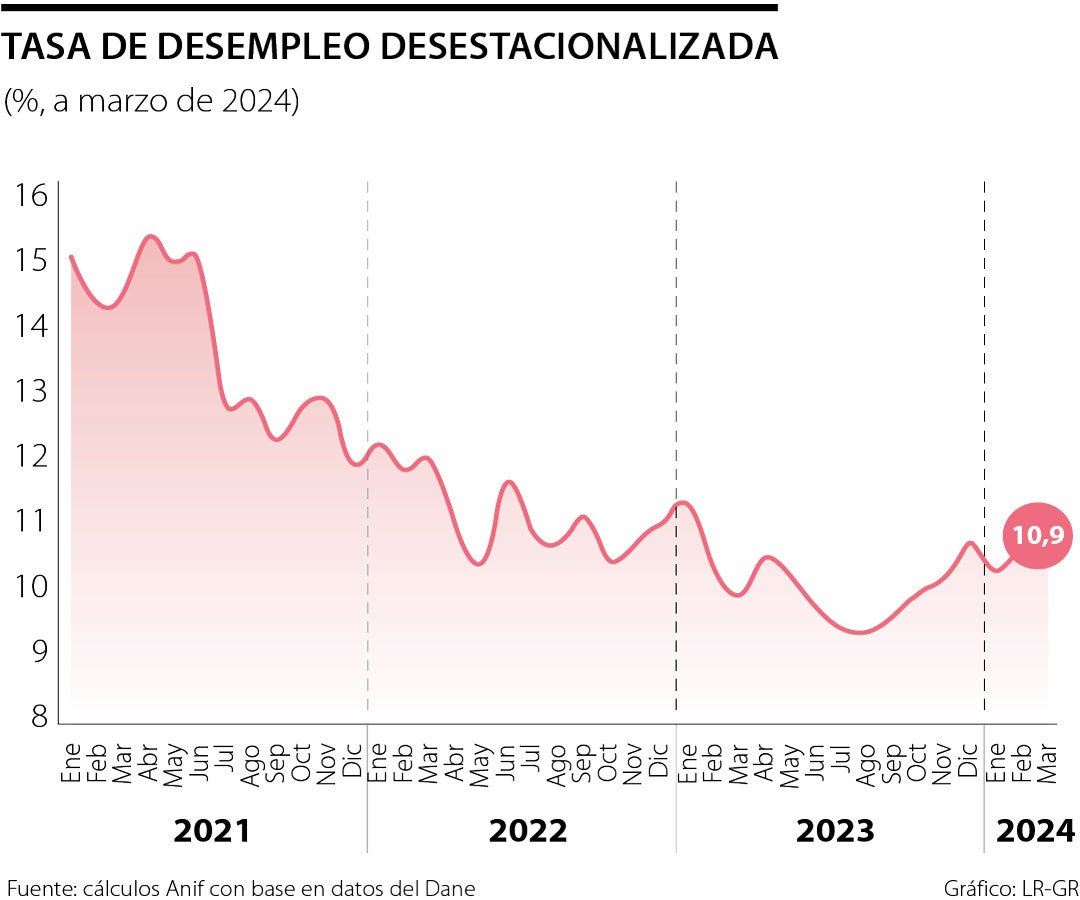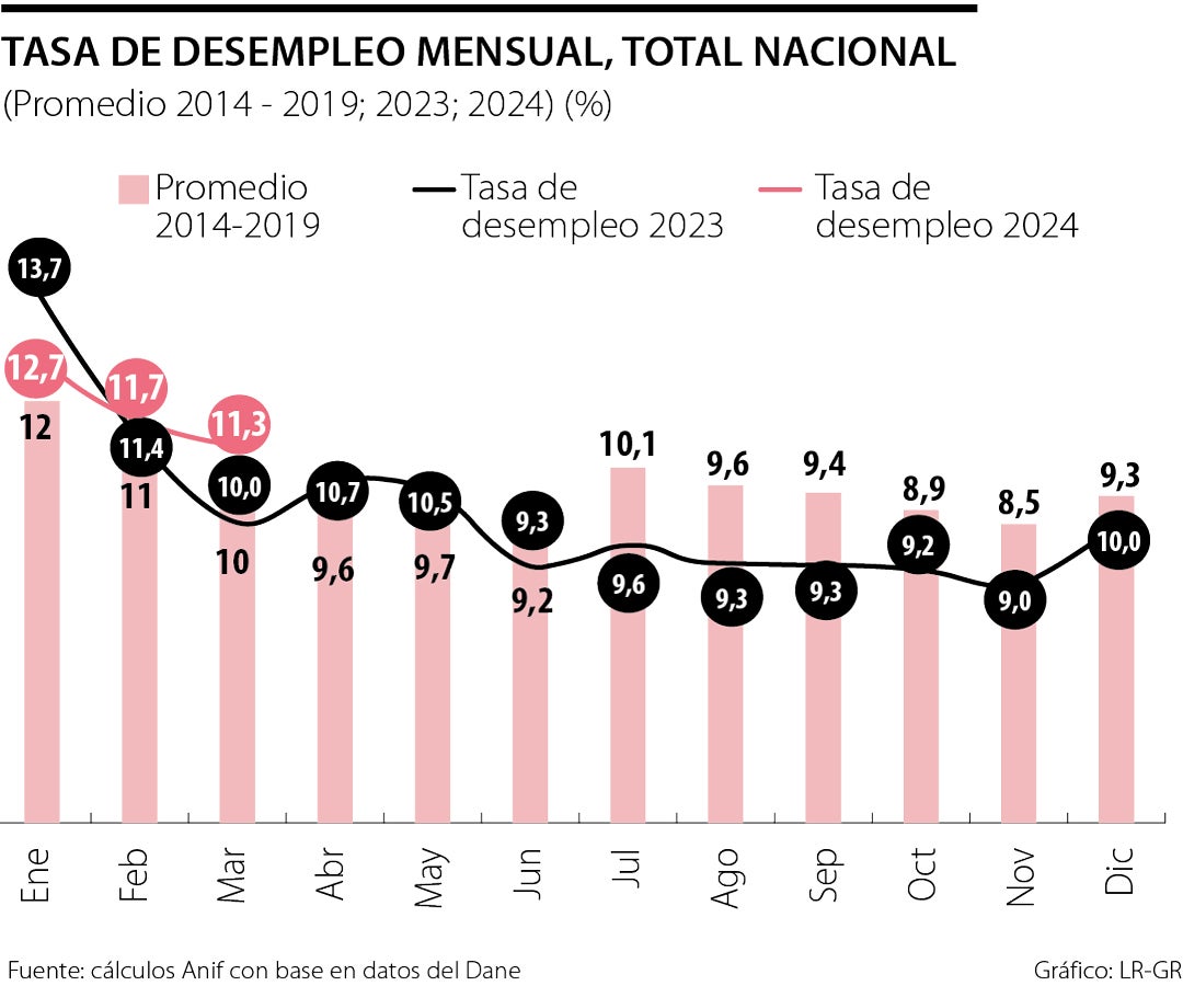 Así, el primer trimestre del año cierra con un panorama negativo. Si bien la primer parte del año se caracteriza por niveles de desempleo más altos, la tendencia se mantiene al alza en comparación con los promedios históricos. Con base en esa dinámica, en Anif proyectamos una tasa de desempleo promedio de 11,3% para 2024 y de 11,9% para 2025. Esperamos que el deterioro del mercado laboral continúe, derivado del comportamiento general de la economía que se encuentra lejos de su crecimiento potencial. Si bien los datos de crecimiento de febrero muestran una mejora relativa en comparación con las expectativas del mercado, sectores clave en el empleo como las actividades secundarias y el comercio mantienen un pobre desempeño que afecta la generación de nuevos puestos de trabajo.