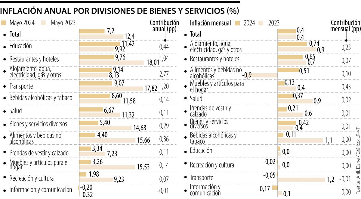 El Dane publicó el resultado de la inflación para mayo de 2024. La variación anual fue 7,16%, es decir 5,2 puntos porcentuales (pp) inferior al resultado de mayo de 2023. Sin embargo, luego de 13 meses consecutivos de reducciones, este resultado representó un estancamiento de la inflación anual en el mismo nivel de abril de 2024.