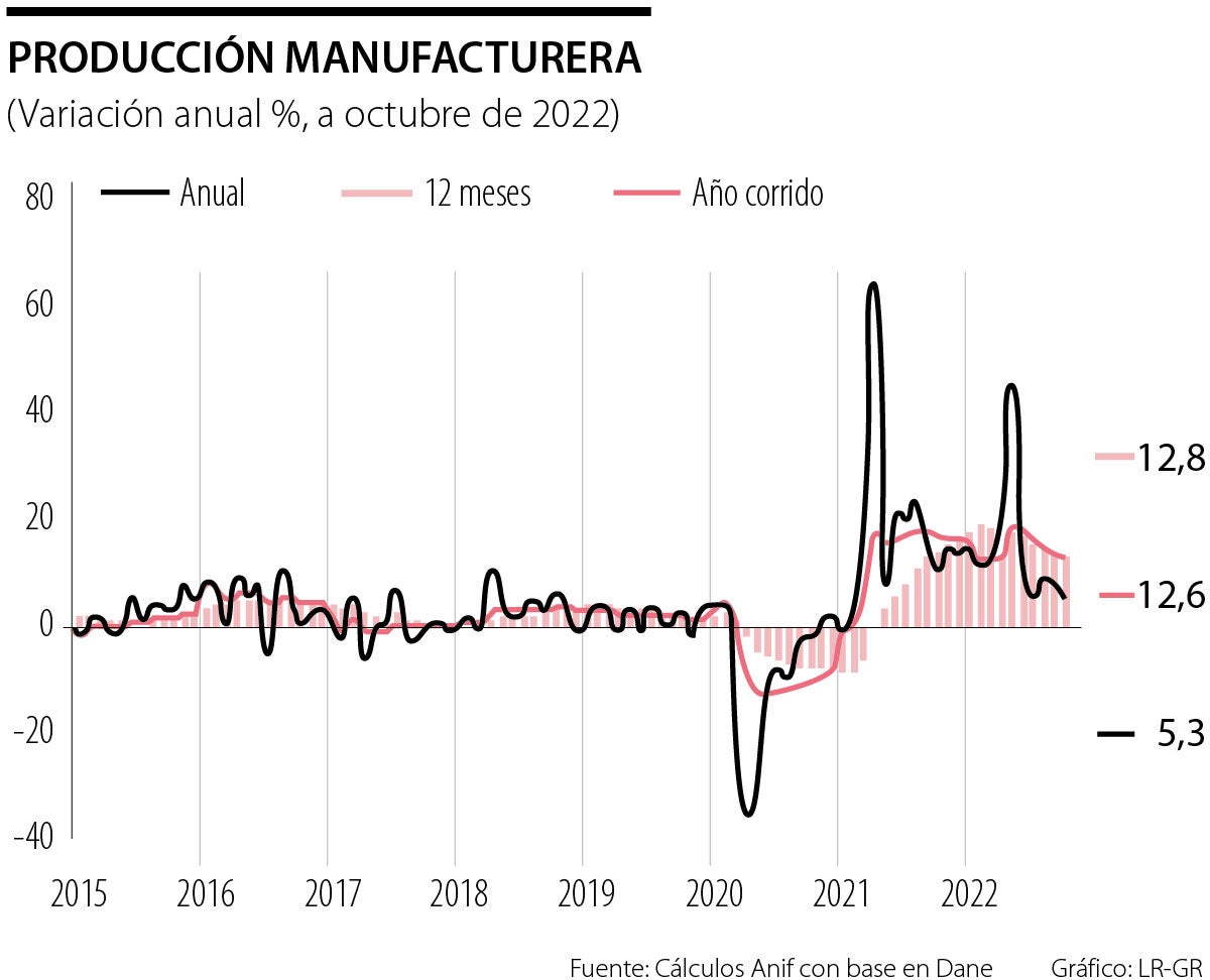 En octubre de 2022 la producción real de la industria manufacturera creció 5,3% frente a octubre de 2021. A su vez, la cantidad de puestos de trabajo aumentó en 3.1%. Al analizar la variación trienal (octubre de 2022 vs octubre de 2019) se observa un incremento de 13,2% en la producción real, en conjunto con un aumento de tan solo 1,4% en el personal ocupado. De igual forma, al analizar la variación 12 meses el Dane señala un crecimiento de la producción real de 12,8% y una variación positiva de 4,7% en el personal ocupado. Por su parte, al analizar las cifras en el año corrido se observa que la producción real aumentó 12,6% y el personal ocupado presentó un incremento de 4,6%.