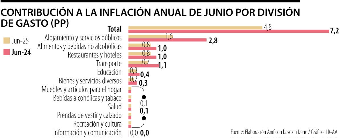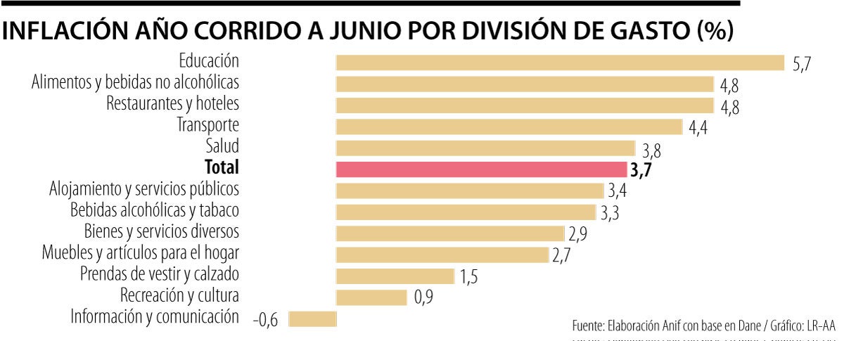 Le siguieron alimentos, y restaurantes y hoteles, ambas con 4,8% año corrido. La división de alimentos mostró la mayor aceleración, pasando de 1,6% en enero a 4,8% en junio, y restaurantes y hoteles exhibió una dinámica similar, avanzando de 1,9% a 4,8%. Recreación y cultura (0,9%) registró la menor inflación año corrido, mientras que información y comunicaciones registró una variación negativa (-0,6%).