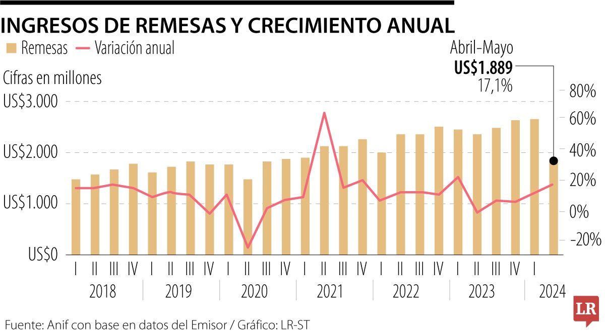 Las remesas, definidas como aquellos flujos de divisas enviadas a su país de origen por nacionales no residentes, se han convertido en una de las fuentes de financiamiento externo más importantes del país en el último año. Estas han presentado un crecimiento constante y positivo, lo que ha hecho que aumente su relevancia macroeconómica para el país. En el primer trimestre de 2024, las remesas registraron un crecimiento de 9,9%, lo que resulta en una expansión hasta mayo de 12,7%. Eso vuelve a encaminar las remesas a la tendencia previa a la pandemia, razón por la que resulta relevante analizar en detalle su desempeño reciente y discutir su importancia para el país.