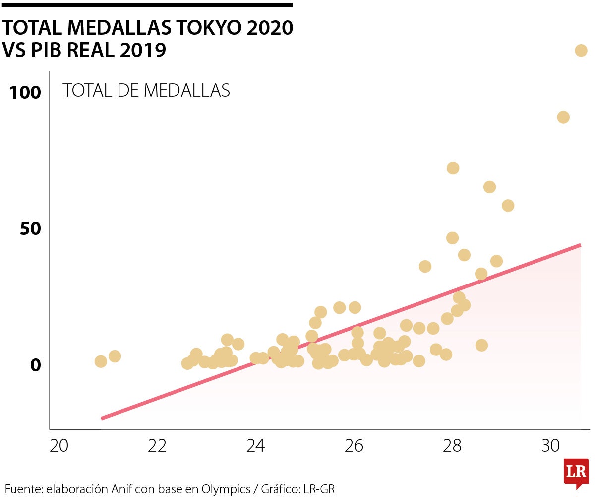 Surge la pregunta de si esta relación puede evidenciarse en los datos. Al analizar el total de medallas ganadas en los pasados juegos Olímpicos de Tokyo 2020 contra la actividad económica del 2019, se observa una clara relación positiva entre el PIB y el total de medallas obtenidas. El medallero lo lideran Estados Unidos, China y Japón, con Reino Unido, Francia, Alemania e Italia formando parte del top 10. No sorprende que estos países también sean aquellos con las economías más grandes del mundo.