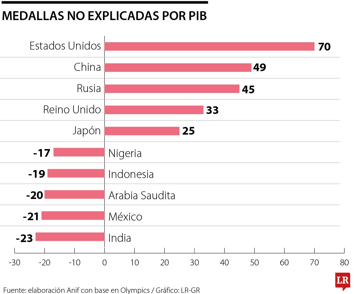 Estados Unidos, China y Reino Unido destacan como los países que consistentemente lideran el medallero. Ahora bien, estos países no solo tienen grandes economías, sino que también invierten significativamente en sus programas deportivos. El gráfico 2 permite ver los países con mayor y menor número de medallas no explicadas por el PIB. Con esto, se puede ver, que existen otros factores (culturales, religiosos, inversiones, estímulos al deporte, suerte, etc) además del PIB, que explican los resultados de las contiendas. Si bien este ejercicio ignora posibles relaciones del PIB con otras variables, sugiere que también hay otras fuerzas que explican el éxito o fracaso en los Juegos Olímpicos.