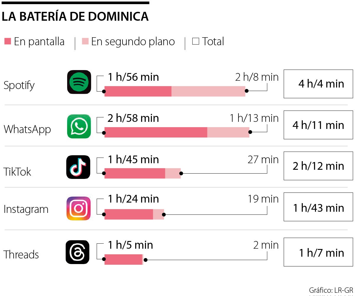 Le eché un vistazo a cómo se gasta mi batería, la pila del celular, para aprender un poco más de mí y de cómo distribuyo mi tiempo (ver el gráfico). Por razones de mi trabajo, estoy muy metida en el universo de Spotify, casi cuatro o cinco horas al día dependiendo de cada jornada; otras 4 horas con mis contactos de WhatsApp; poco más de un par de horas en Tik Tok; casi dos horas en Instagram, y desde esta semana, más de una hora en Threads. No hay mucho tiempo para más, a esto se le debe sumar el tiempo en el que es mala educación e innecesario estar con el celular.