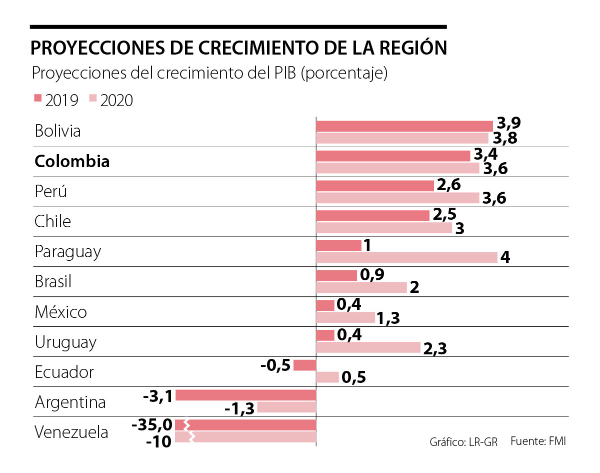 En Ecuador la decisión de eliminar los subsidios a la gasolina para cumplir el acuerdo con el FMI generó protestas similares a las de finales de los 90 e inicios del presente siglo, que derrocaron a Abdalá Bucaram, Jamil Mahuad y Lucio Gutiérrez. En Argentina, el ajuste gradualista del presidente Macri, diseñado de esta manera para mitigar el impacto social de la estabilización macroeconómica, no fue efectivo. Desde 2017 el gobierno se ha visto obligado a implementar medidas para contener una crisis cambiaria, y el regreso reciente del peronismo al poder aumenta la probabilidad de ocurrencia de esta crisis. Por su parte, el modelo económico chileno logró llevar al país al nivel de países de ingreso alto, con un PIB per cápita tres veces más grande que el colombiano, pero con una desigualdad muy similar. Las recientes protestas contra ese modelo han sido multitudinarias. Finalmente, la expectativa de crecimiento en Brasil está por debajo del 1%, con una muy baja popularidad del presidente Jair Bolsonaro. En el otro extremo, aunque las proyecciones de crecimiento de Bolivia estaban entre las más altas (3,6% para 2019), las protestas por un posible fraude electoral que busca la permanencia de Evo Morales en el poder pueden afectarlas. México también se encuentra en aprietos. Su pronóstico de crecimiento es de 0,25% y está sufriendo una crisis institucional generada por el narcotráfico.