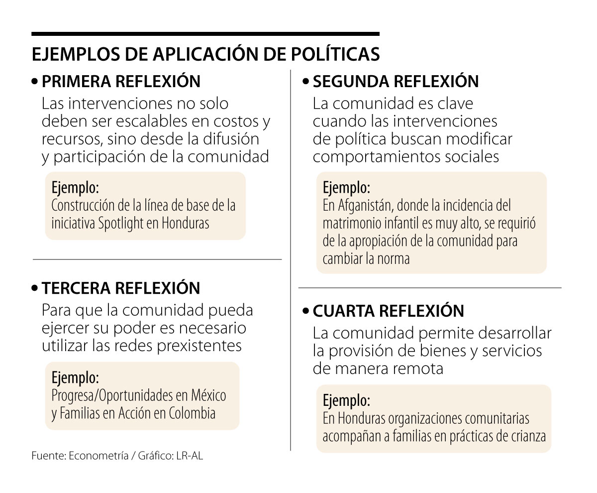 La segunda reflexión es que la comunidad es clave cuando las intervenciones de política buscan modificar comportamientos sociales. Las normas sociales son reglas y expectativas de cómo se deben comportar las personas para evitar conductas que aunque sean aceptadas puedan afectar negativamente a ciertos grupos poblacionales.