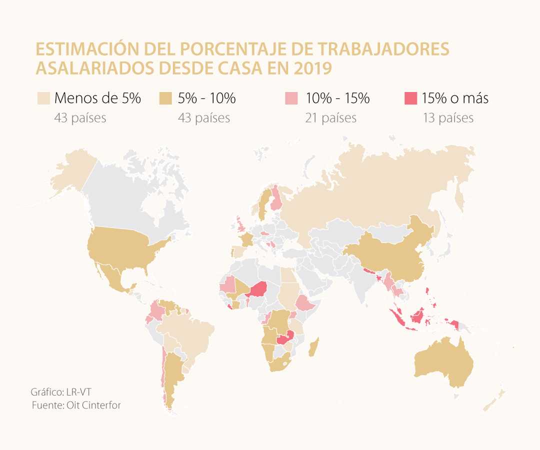 Ahora, debido a la pandemia, la OIT estima una potencialidad del teletrabajo del 18,8% entre los empleados a nivel global; cifra que se eleva hasta el 55,1% entre los países de ingresos altos. En términos de personas, la prospectiva es de 260 millones de trabajadores en el mundo bajo esta modalidad.