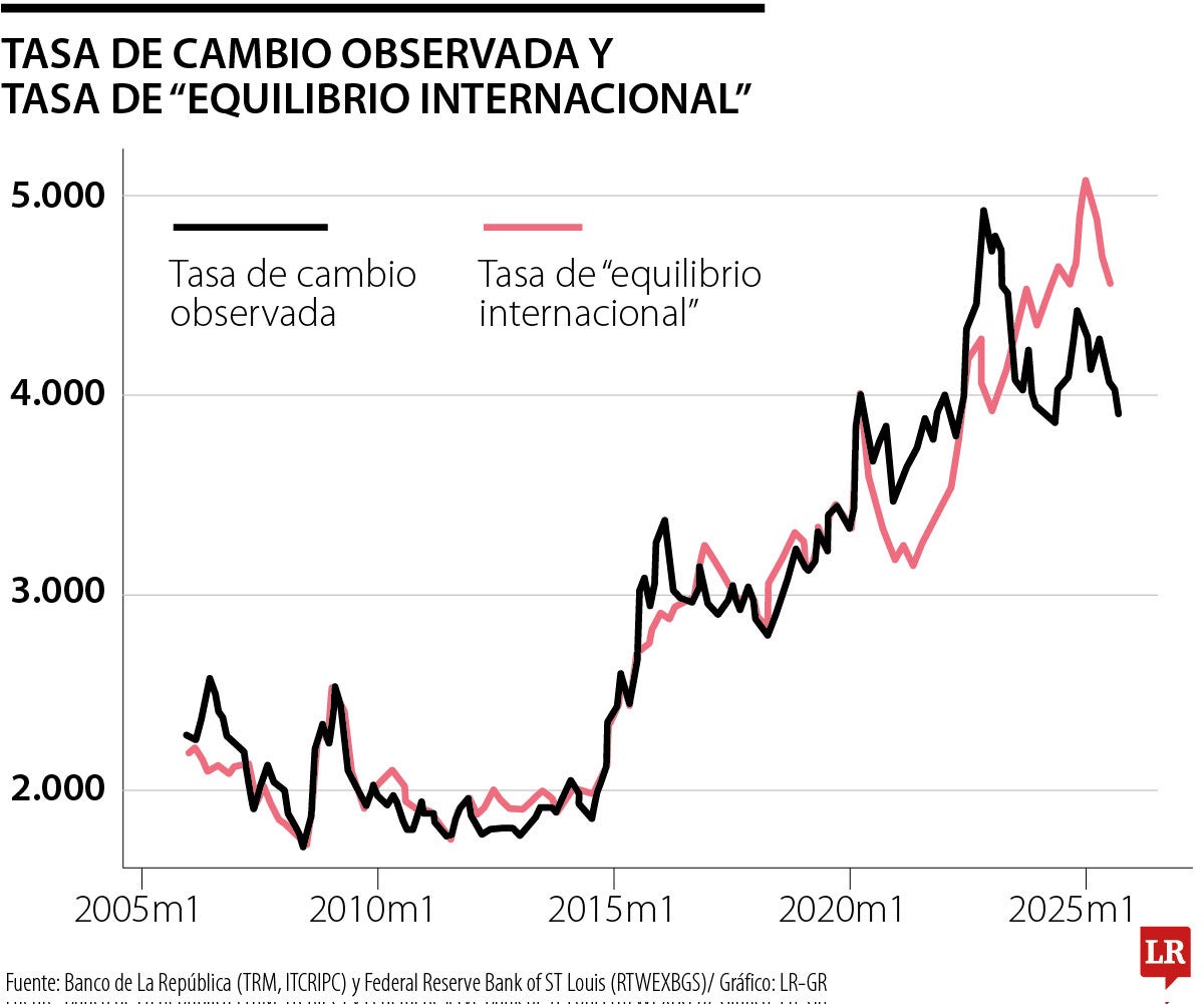 El caso es que en los últimos años la tasa de cambio observada se ha desviado más que nunca de su valor de “equilibrio internacional”. En noviembre de 2022 se disparó hasta llegar a $5.061,21, bien por encima de los $4.018 de “equilibrio internacional”, pero desde ahí cayó y durante cerca ya de dos años ha estado por debajo de su valor de “equilibrio internacional”. Actualmente está por lo menos un 13% por debajo.